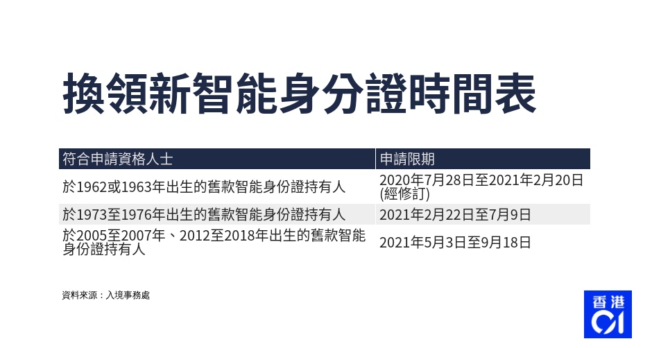 身份èæé 2020 æºè½èº«ä»½èæ°æé æé"表 æèå°å é ç´éç¥æ´å Holidaysmart åææ¥å¸¸ from image.presslogic.com May 05, 2021 · 現時更換智能身份證的組別為1970至1972年出生人士,以及1973至1976年出生人士。 Feb 03, 2021 · 新智能身分證於2018年推出,逐步要求指定出生年份的市民換領。 入境處公布,1973年至1976年出生,即現年45至48歲的市民,可於2月22日至7月9日期間申請換領身分證;2005年至2007年,以及2012年至2018年出生的小朋友,亦可在今年5月3日至9月18日申請換領。 See full list on moneyhero.com.hk See full list on moneyhero.com.hk 入境處在是次全民換證計劃中加入全新的關愛安排。該安排是換證人士在其所屬年齡組別獲邀更換新證時,可攜同其2名於2019年時年滿65歲或以上(即1954年或以前出生)的親友一同前往換證,讓這些長者其後毋須自行前往換證。 資料來源:入境處 相關閱讀:bno 網上新申請/續領程序教學 想知道最新嘅理財貼士,就要留意 moneyhero blog,同埋緊貼我哋嘅 facebook page! Jun 10, 2021 · 以下年份出身兒童需要在 2021年5月3日至9月18日 的期限內完成新智能身份證換領: 於2005至2007年出生 2012至2018年出生,並持有舊款智能身份證(簽發日期為2018年11月24日或之前)* See full list on moneyhero.com.hk